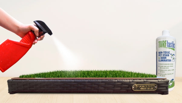 Then, use a spray bottle filled with water to freshen up the grass. You can even add Piss Off (not included) to eliminate odor-causing bacteria.