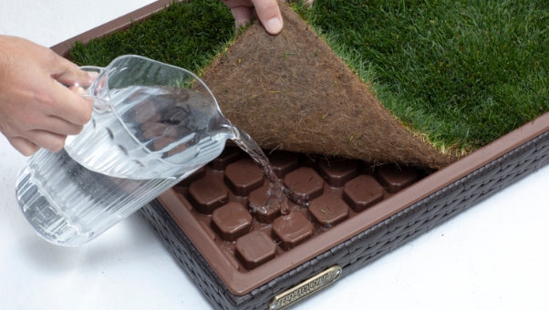 Porch Potty MINI comes with a watering tray and fresh sod, which should be replaced every 1 to 2 months.
