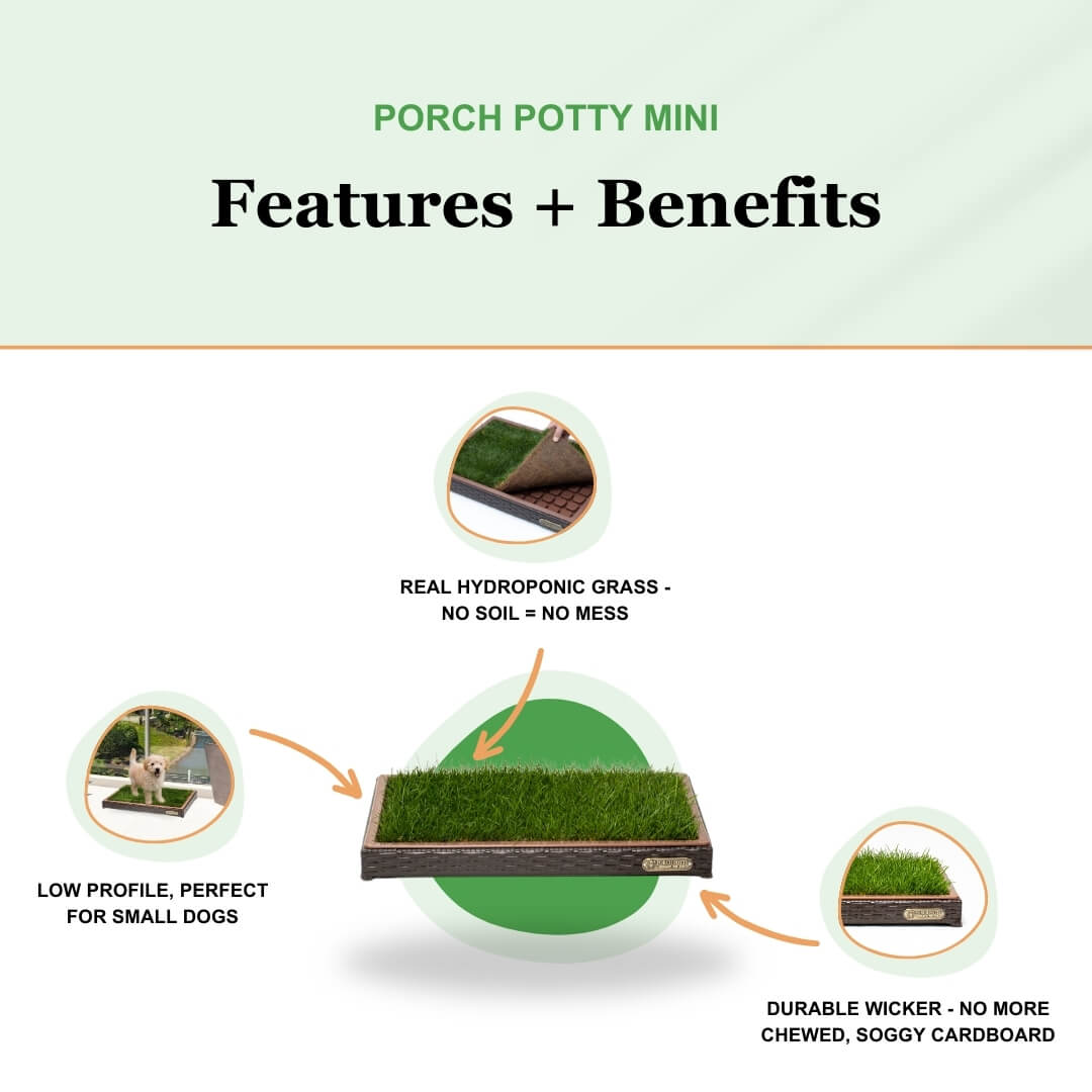 Porch Potty MINI is truly one of a kind. It has a durable yet stylish wicker design, real hydroponic grass, and a unique watering tray that makes cleanup easy and low maintenance.Our grass dog potty is also more economical. Cardboard dog potties and puppy pee pads can come out to hundreds, even thousands, of dollars a year. With Porch Potty MINI, you only pay $149, plus the cost of grass.Finally, Porch Potty MINI is more sustainable. Unlike puppy pee pads and cardboard dog potties that have to be thrown away constantly, the Porch Potty MINI can be used over and over again, making it a much more eco-friendly and long-lasting option.
