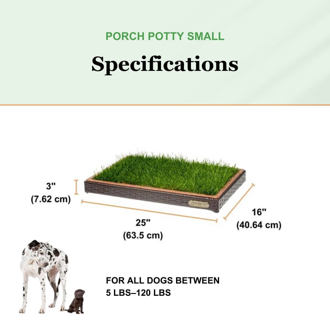 - Items Included: Porch Potty MINI (wicker frame and watering tray), fresh sod, dog potty training booklet, user manual