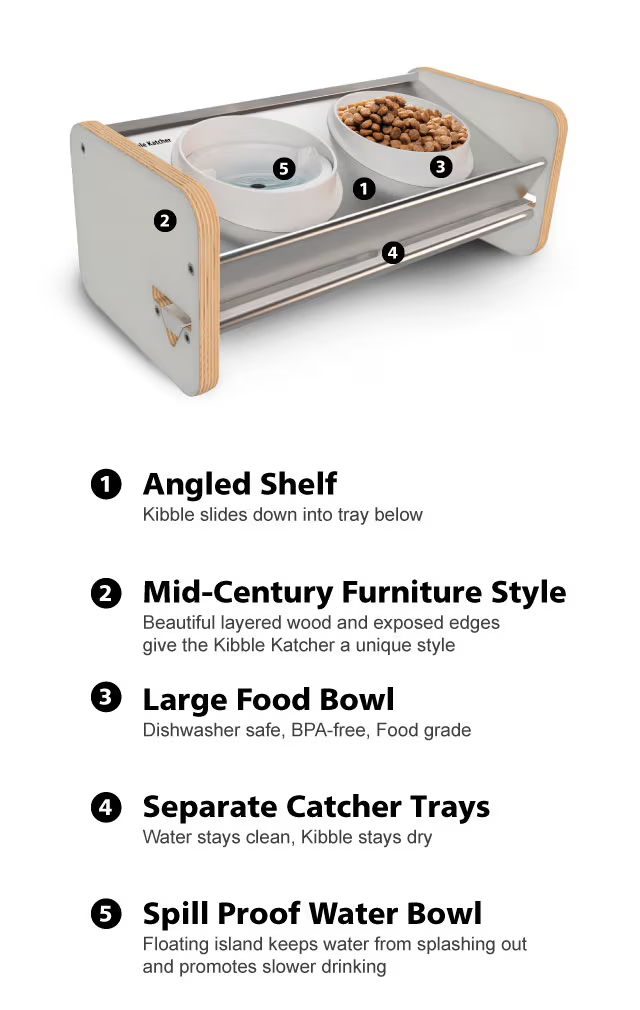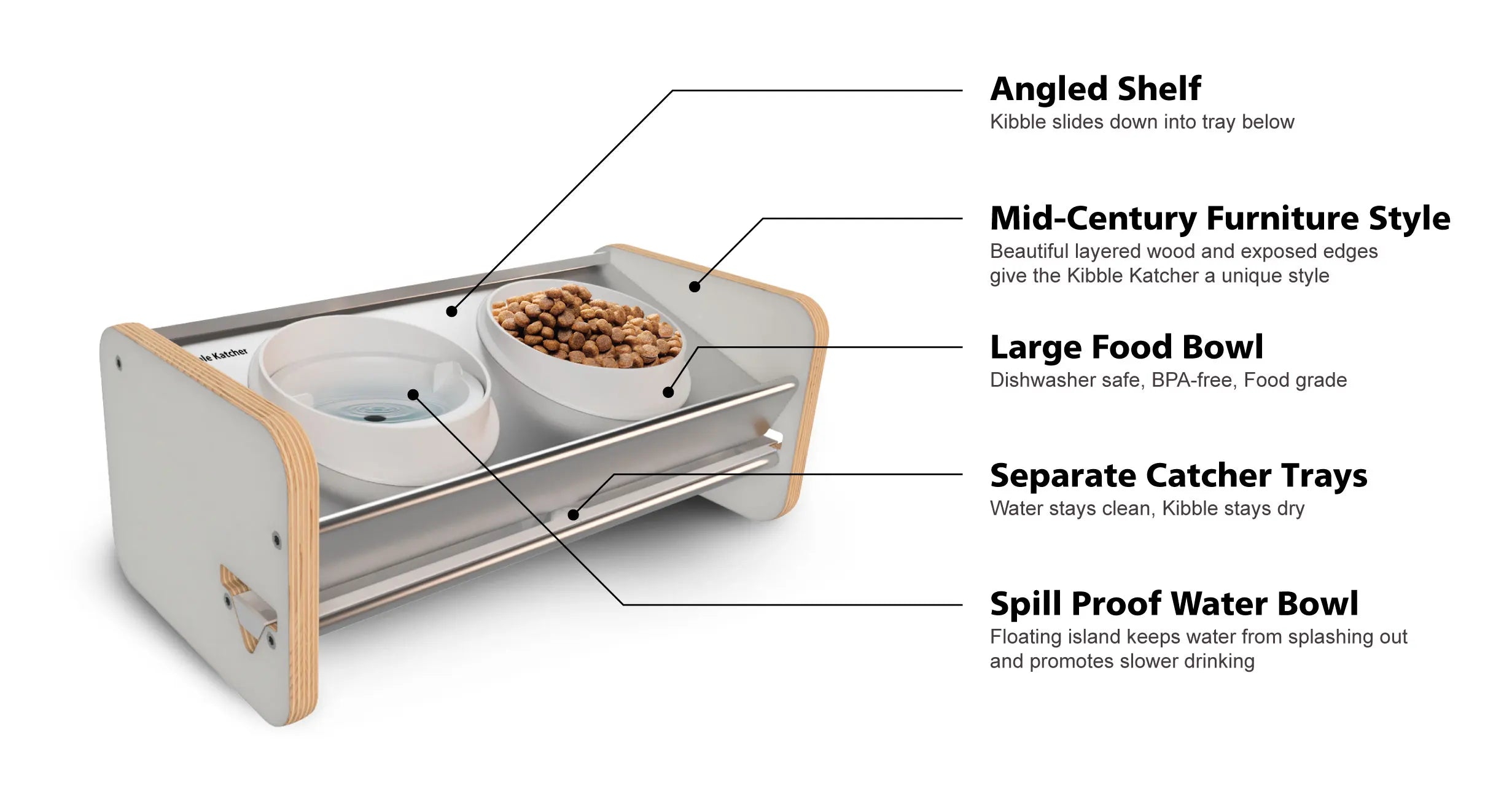 The Kibble Katcher is designed to allow escaped water and kibble to slide down into separate Katcher Trays. Dry food stays dry and won't become a breeding ground for harmful aflatoxins