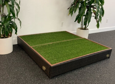 Built by bolting 2 Porch Potty STANDARD together, this extra-large dog potty features the same great construction as our other models. It has a durable resin wicker design and self-draining system that makes cleanup easy. Simply rinse the grass with a watering can and Porch Potty will drain itself, leaving behind no mess, no stress, and no odor.